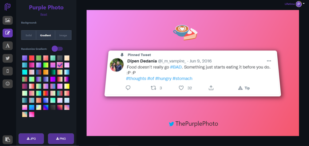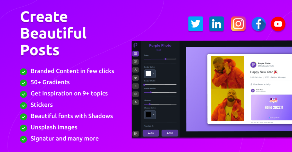 If we take Twitter, in a single day there are roughly around 500 million tweets. Now if we add Instagram, Facebook, Reddit, etc posts, the number goes way up. To stand out among these so many tweets & posts, you need to have unique & rich content that everyone loves. Creating rich images for the post is a time-consuming job. With Purple Photo, you can create rich posts with real-time previews in a few clicks.